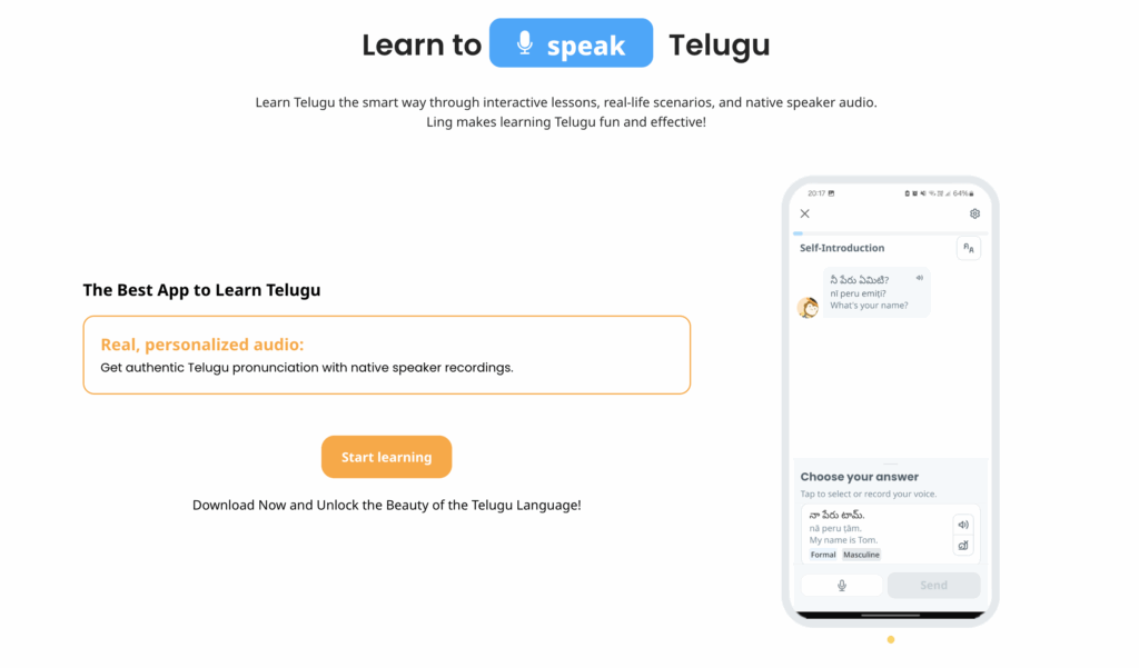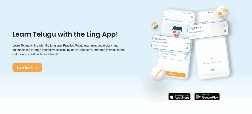 The Ling App is your go-to platform for learning Telugu in a modern, engaging, and flexible way. With voice recognition, native speaker audio, cultural notes, and fun lessons, Ling helps you build real communication skills from the very first day.
